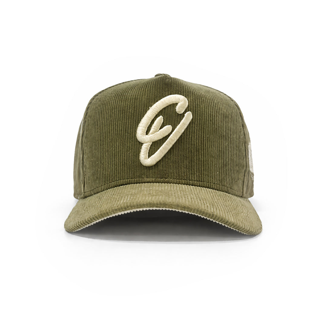 Our staple hat, crafted from ribbed cotton corduroy & cotton twill. Featuring a contrast of material, with a unique cotton twill crown & corduroy brim. On the front, our signature "CV" embroidered, complimented by a graphic patch on the left face. Adjustable snapback, one size fits all